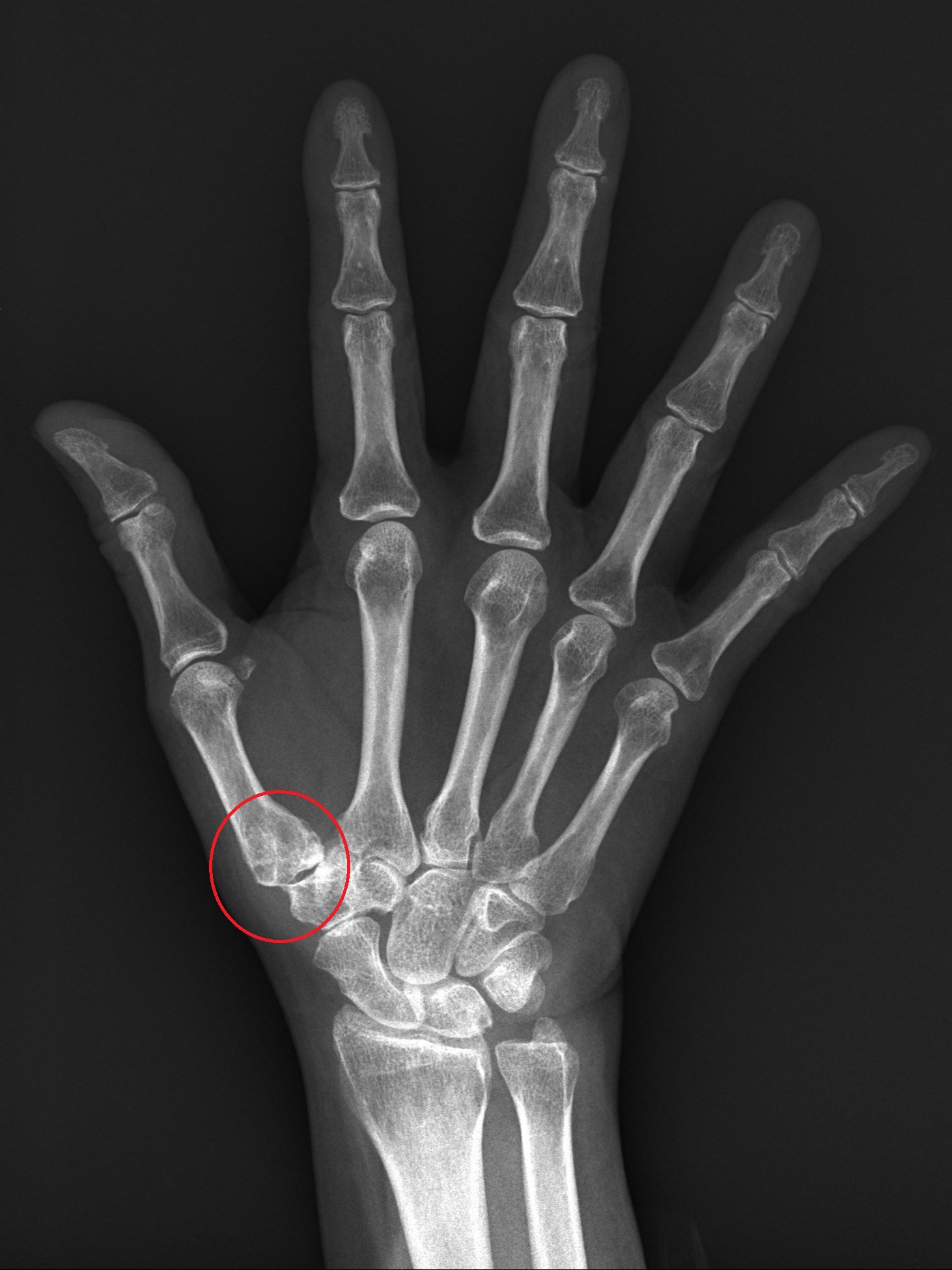 圖說 術前X光看到拇指根部關節有滑脫情形,微創手術會視情況用鈦合金或可吸收螺絲固定在第二掌骨基部