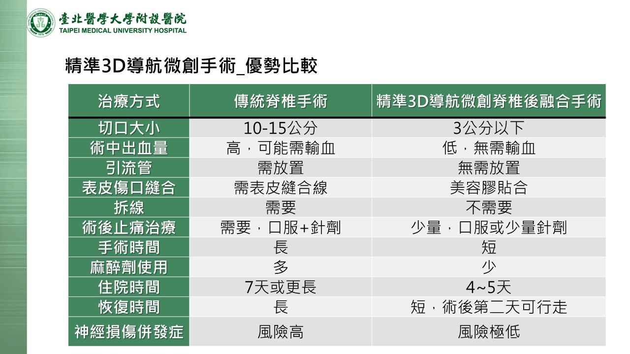 傳統脊椎手術切口大、出血量多、感染風險高、住院時間較長且術後疼痛感明顯。微創手術雖改進前述問題,但手術時仍須仰賴X光透視定位,恐致高劑量輻射的暴露風險,3D導航微創脊椎融合手術如同開車使用導航,導航系統提供的即時3D立體影像圖,模擬脊椎環境,醫師宛如擁有透視眼,下刀前就能了解患部狀況,精準植入骨釘植入,且傷口不到3公分,不僅保留微創手術的優勢,更顯著降低輻射暴露,讓手術更加安全。