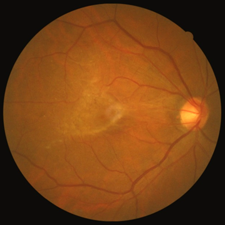 根據統計,黃斑部皺褶的好發率大概為總人口的5.3%到18.5%。而早期的黃斑部皺褶通常沒有明顯的症狀,臨床上需透過眼底鏡檢查(圖一)或是同調共軛光掃描儀(圖二)來診斷。