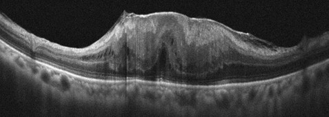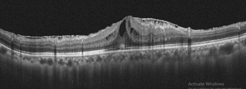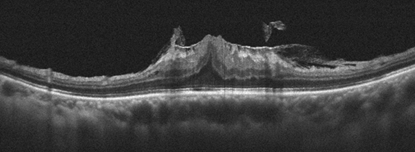 (圖四)共軛光掃描儀檢查發現左眼黃斑部皺褶已導致黃斑部結構嚴重變形。