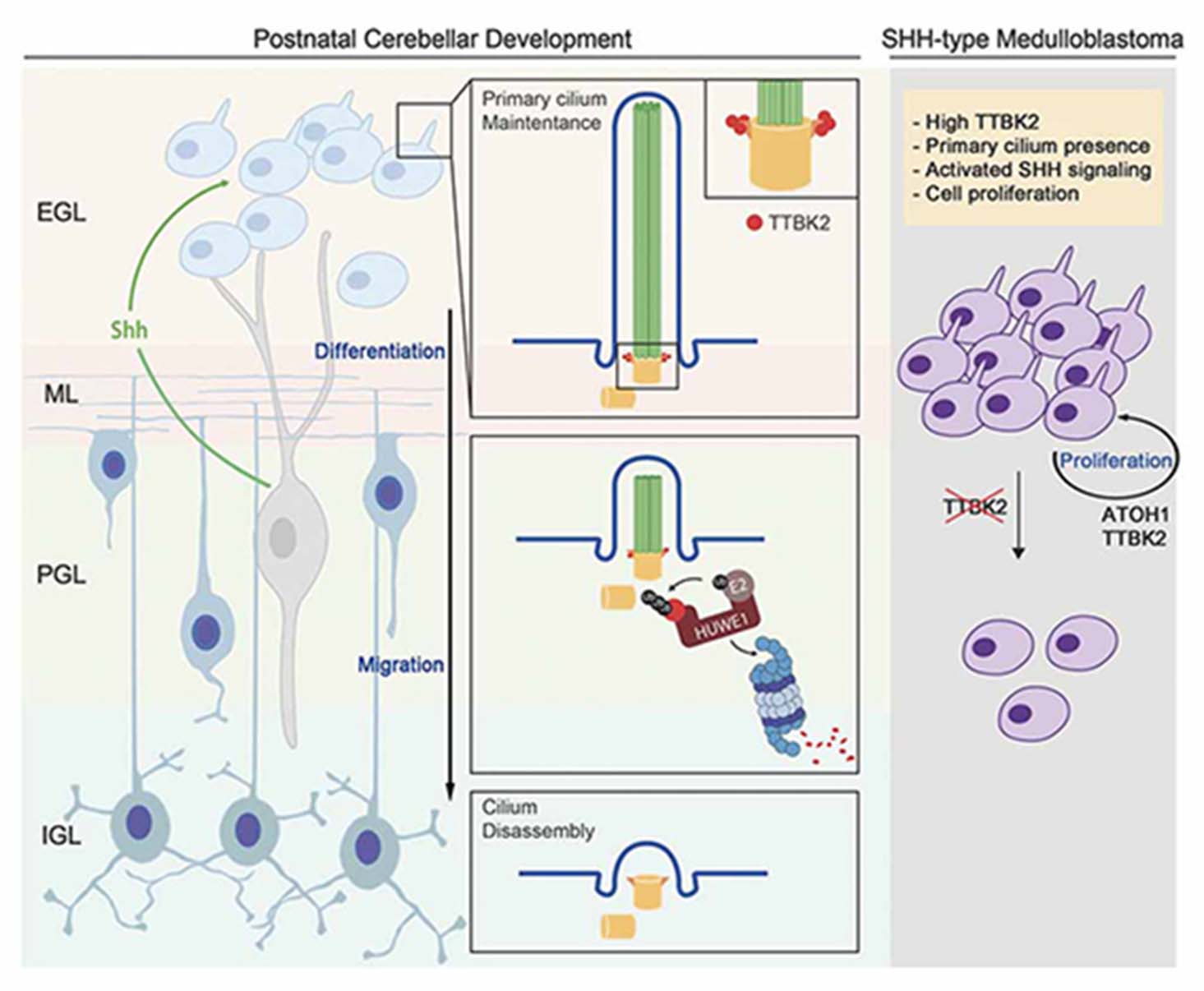 小腦的發育仰賴一群名為「顆粒神經元前驅細胞」(granule neuron progenitor, GNP),精準完成增生與分化。而這些細胞的表面都有長著一根像天線般的初級纖毛(primary cilia),負責接收生長訊號。