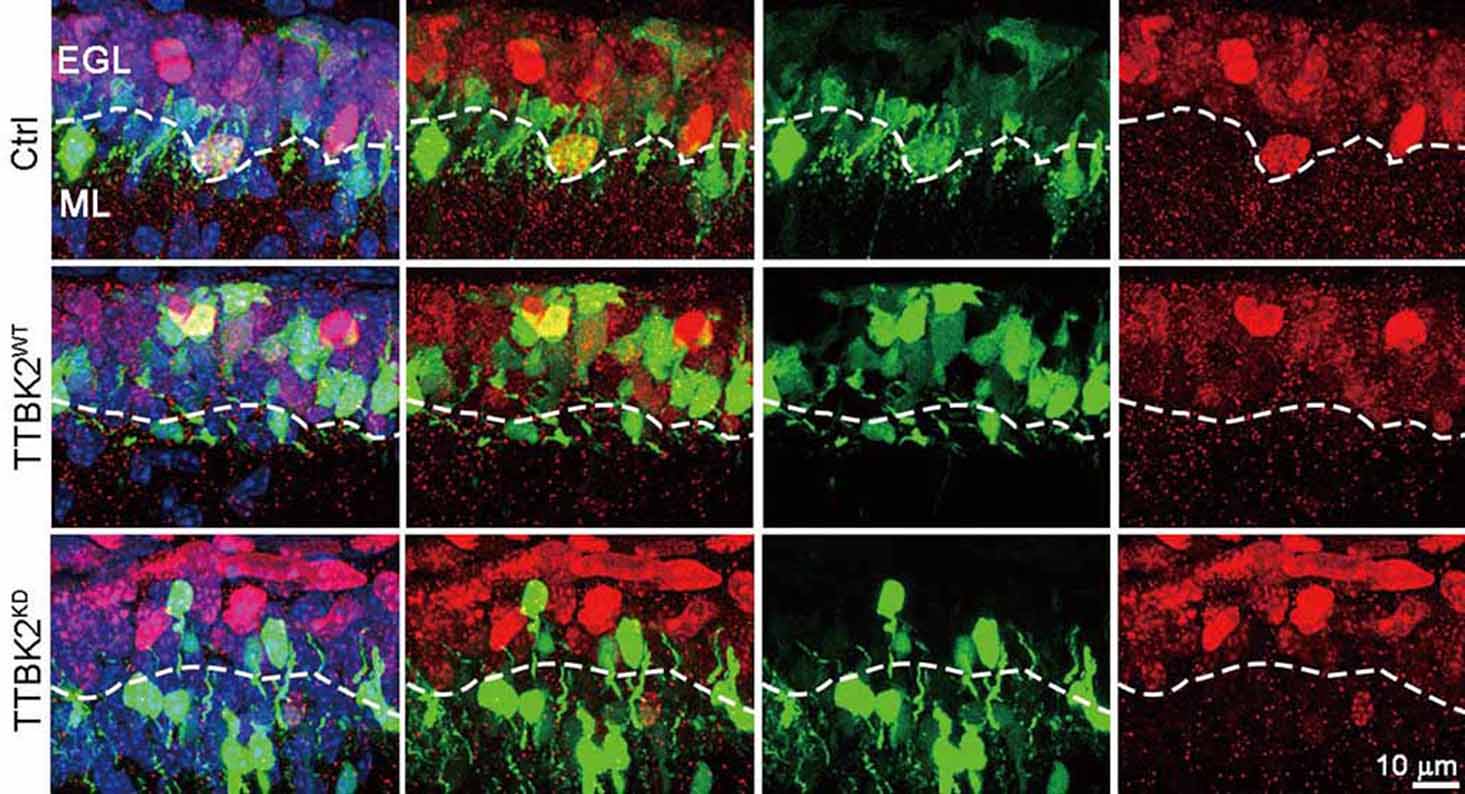 發現TTBK2的活性能促進小腦顆粒神經前驅細胞(GNP)的增殖,顯示它在腦部發育與疾病中扮演關鍵角色。