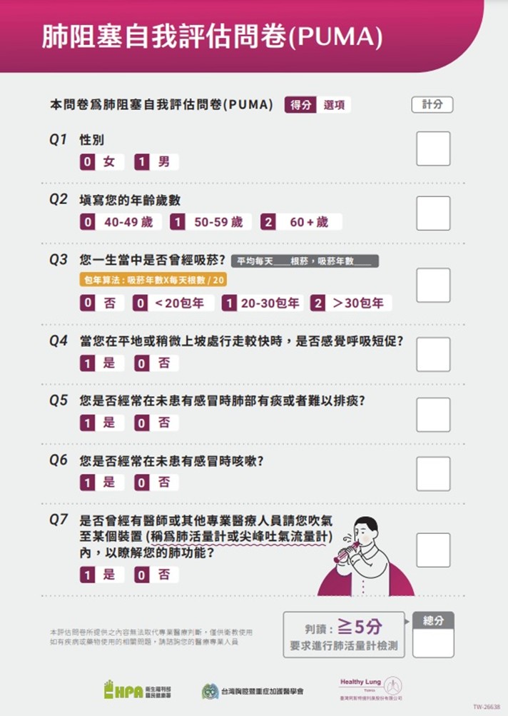 國健署強力推動戒菸計畫與戒菸服務改革,將 PUMA(肺阻塞自我評估問卷)導入門診與健檢現場,目前全台有近3,000家戒菸合約醫事機構(醫院、診所、衛生所及藥局),已涵蓋全國99.5%的鄉鎮市區,透過巡迴醫療可達100%。期盼在政府與學會的攜手推進下,能盡早實現肺阻塞退出國人十大死因之列。