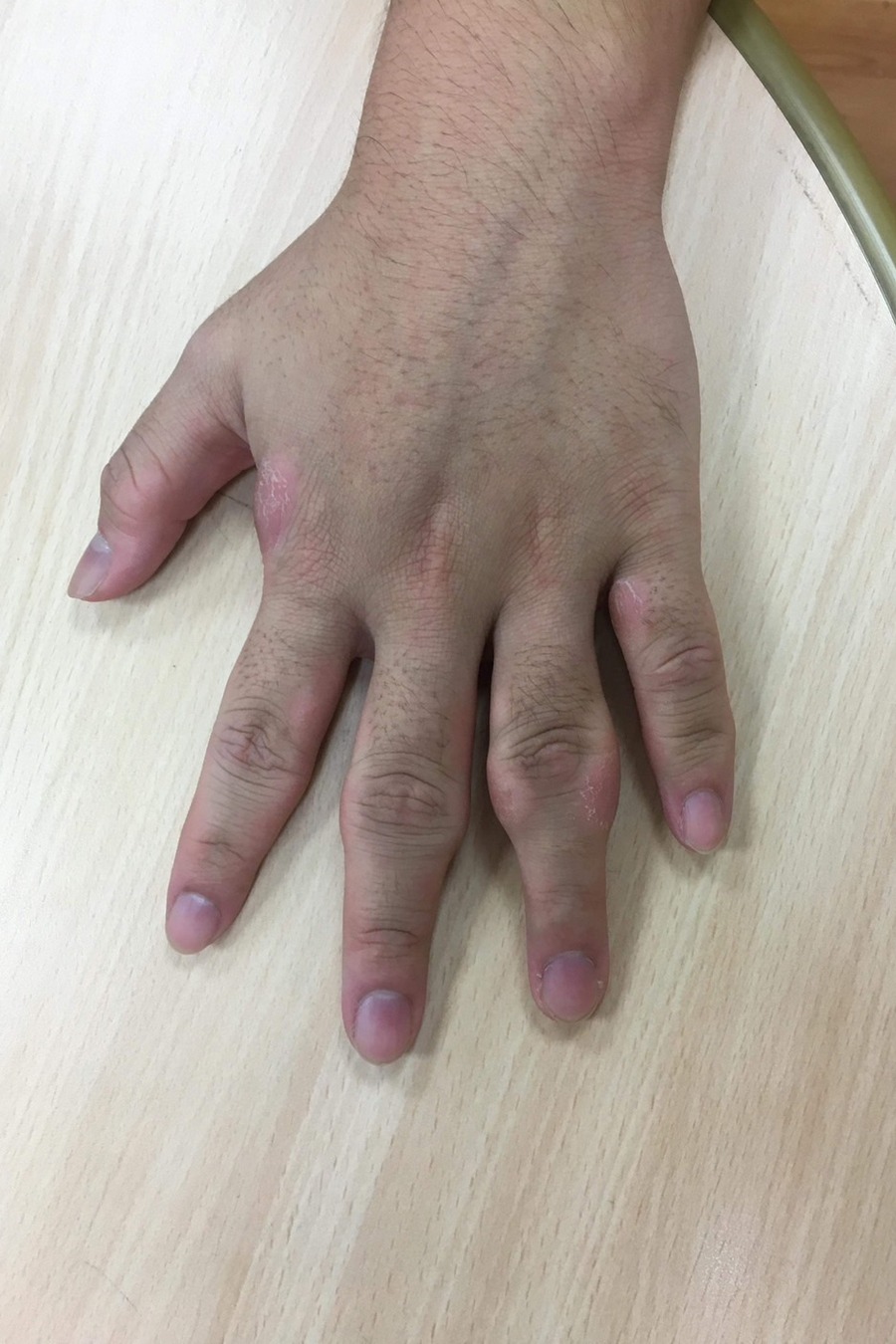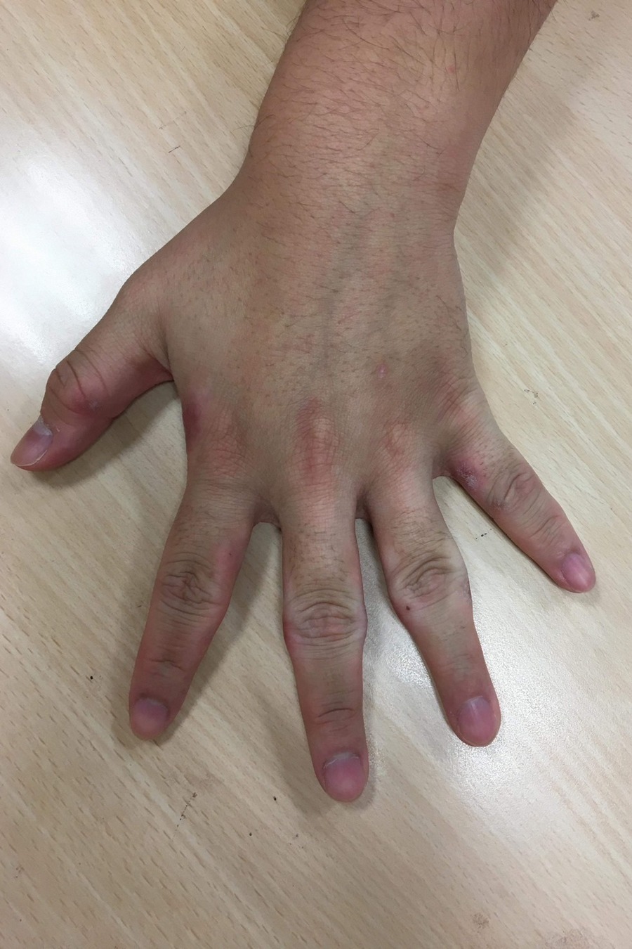 22歲的余同學從小有折手指的習慣,前陣子左手的中指及無名指關節莫名腫大,但卻不會痛,也沒有影響活動或其他不適。他曾前往骨科及皮膚科診所就醫,然而拍了X光,確定骨骼沒問題後,擦藥擦了一段時間也都未好轉。抽血檢查排除關節炎或免疫疾病的可能後,根據患部特徵,吳若薇醫師診斷為極少見的「指部厚皮症(Pachydermodactyly)」,予以每兩週一次的局部類固醇注射治療,至今四個月,關節已經明顯消腫,讓余同學不必再為手指外觀困擾。