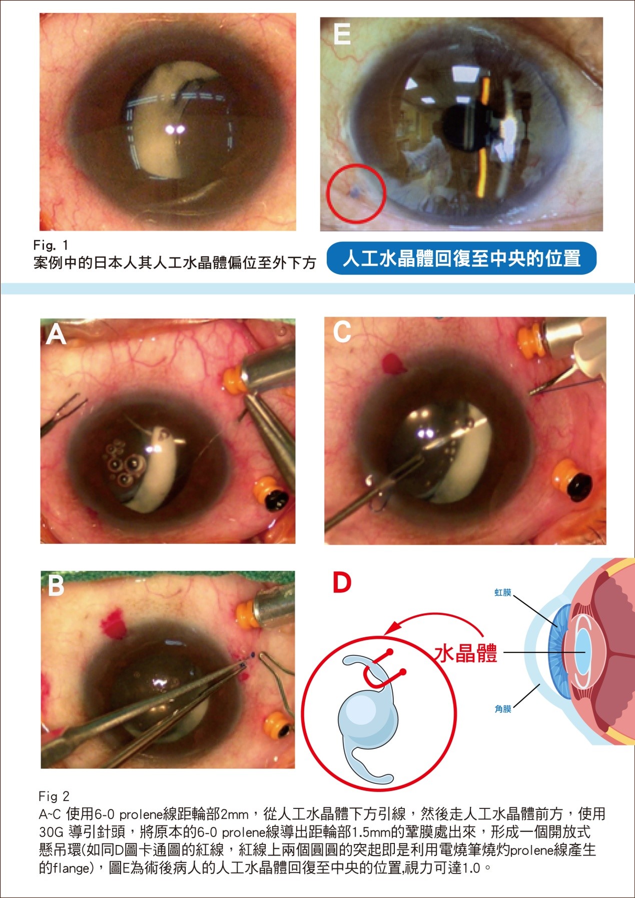人工水晶體復位還是會有一些風險,如眼內出血、視網膜剝離、術後眼壓高、角膜水腫,經過詳細病解後,安排病患進行人工水晶體復位手術,所使用方法是燒灼6-0 尼龍線的方式(Cauterized prolene method),去產生固定端(flange)在人工水晶體的腳上及鞏膜端,以穩定人工水晶體,使得病人重拾視力,不再令人工水晶體晃動,術後視力1.0,無任何特殊併發症,病患直呼水晶體不再晃動終於可以「正視」的感覺真好!